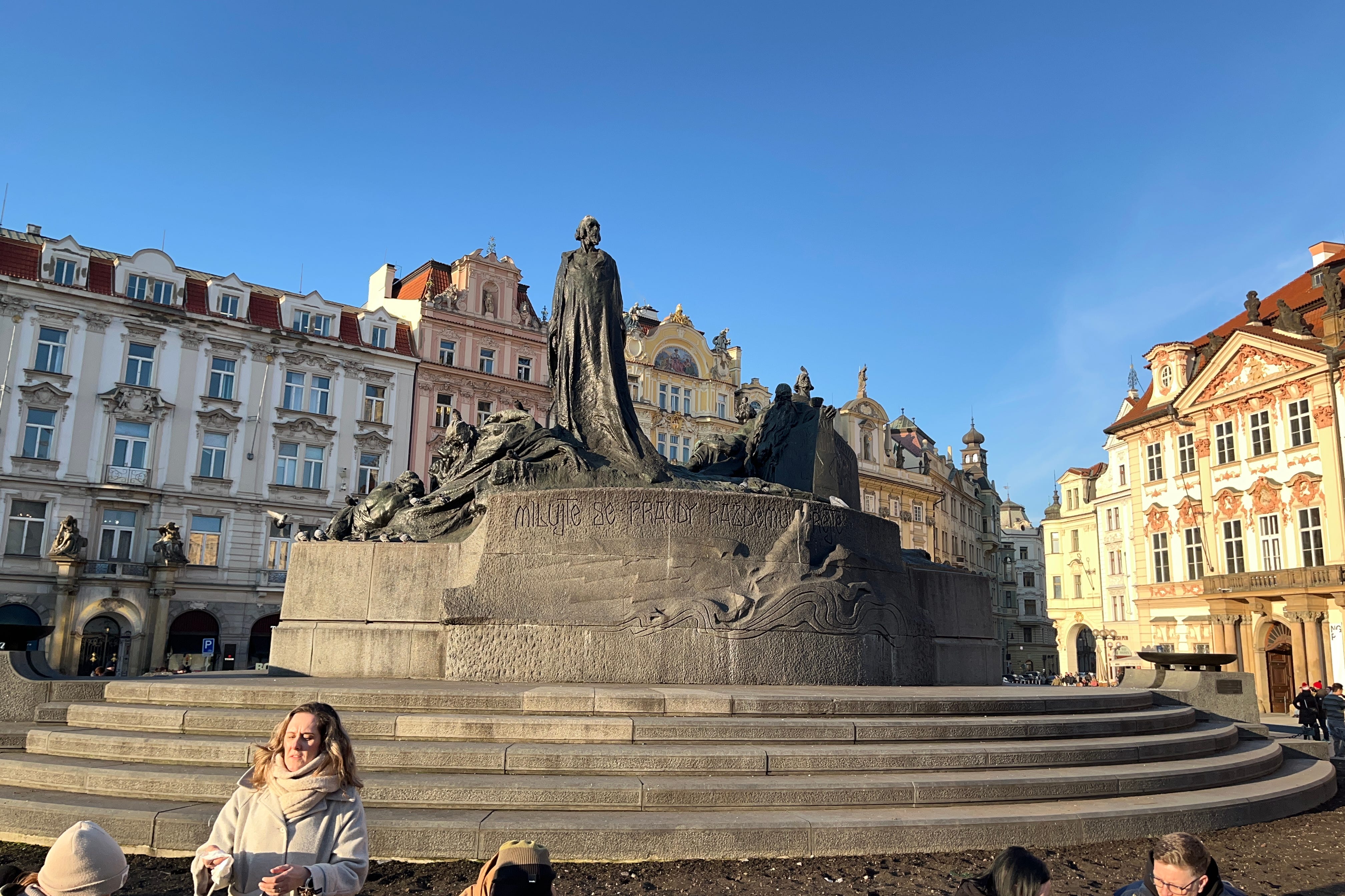 Photos from top: St. Vitus Cathedral and the castle across the Vltava River; statue of Jan Hus in Old Town Square; “Man Hanging Out,” a sculpture of Freud by celebrated Czech artist David Cerny; our meal at U Fleků a few minutes before the exchange with the Slovaks.